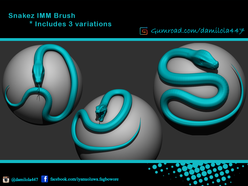 Snakes IMM brush with 3 variants to quickly get snakes into your ZBrush projects.