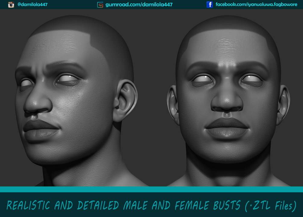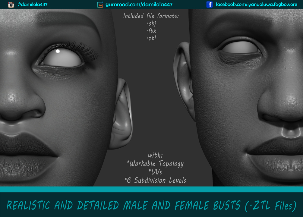Product contains 2 Ztools (.ztl files with 6 subdivision levels), 2 .obj and 2 .fbx files for one Male and one Female realistic bust with surface details. Both busts also come with UVs and workable topology to facilitate further work in 3D programs like Maya, Max, Blender, Substance Painter etc.